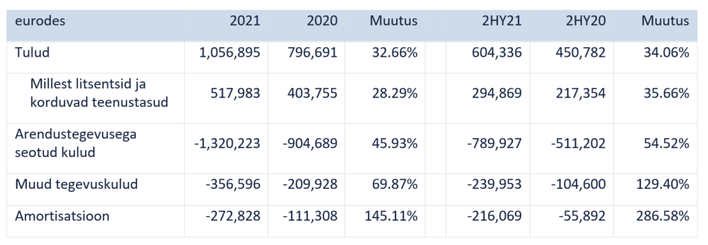 Kuigi arenduskulude kasvu proportsioon on võrreldav müügitulemustega, põhiline arenduskulude kasv toimus 2021. aasta teises pooles, kui ehitati oluliselt tooteid ning integratsioone, millel ei ole kohest mõju, vaid millega suureneb kasvupotentsiaal tulevikus. Osadele teise poolaasta arenduskuludele saadakse ka bilansipäevajärgselt toetust, mida ei ole kajastatud 2021. aasta finantsnäitajates, kuna raamatupidamisstandarditest tulenevad kindluse ja täitmise nõuded ei olnud aasta lõpus veel täielikult täidetud.